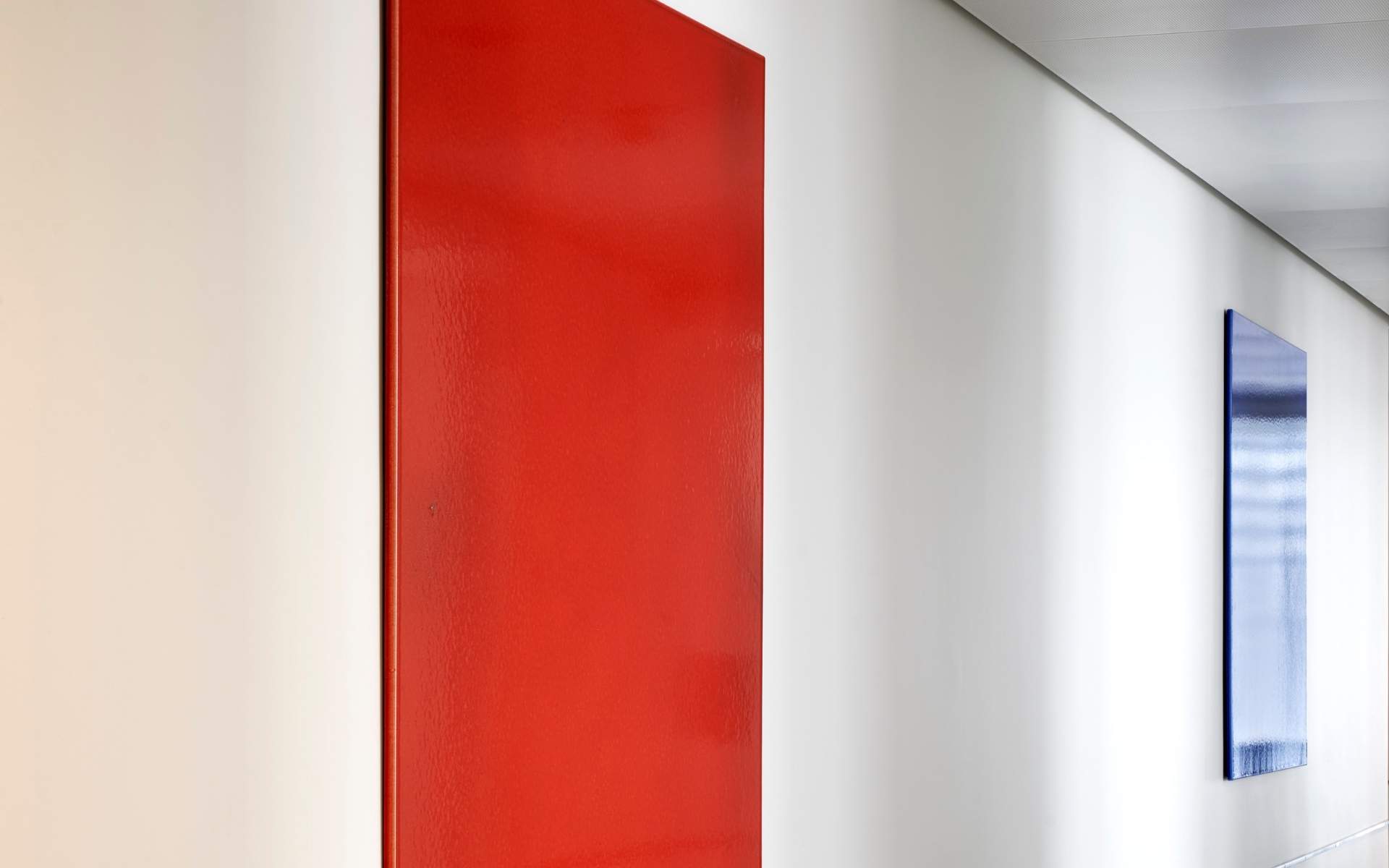 “Thanks to this solution, the glazed panels “play” an important visual role, redefining the perspective and depth of circulation spaces. The natural light becomes iridescent and is balanced in the depth of the corridors depending on the time of day and the colours of the galzes selected" ( written by RPBW )